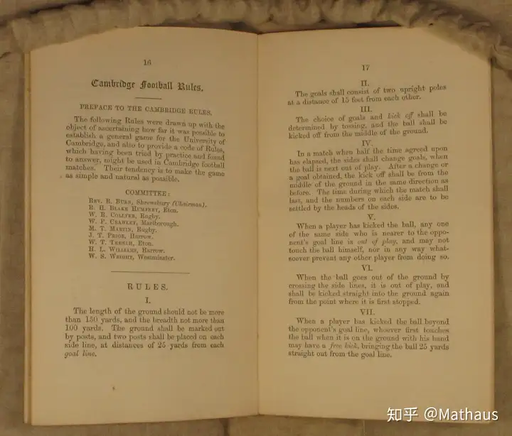 1848年,现代足球第一份文字性的规则《剑桥规则》诞生,《剑桥规则》是早期为剑桥和牛津两所大学之间进行的足球比赛所制定的规则,当时英格兰学校每套宿舍住10名学生和1名管理员,于是规定足球比赛每方11名队员参赛,现在主流的11人制足球就是从那时开始的;