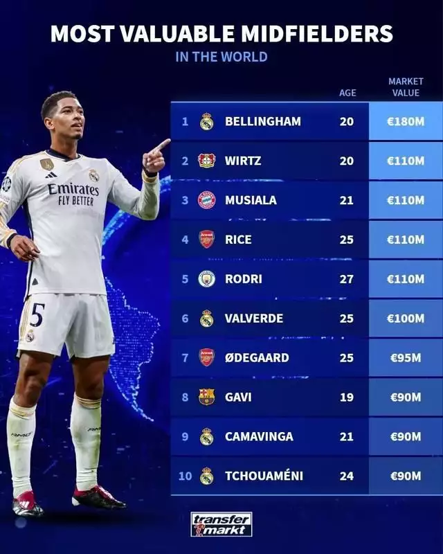 维尔茨可谓是最近两个赛季德甲最炙手可热的中场球员,尤其是本赛季在阿隆索的调教下,维尔茨再次完成了蜕变。灵动、飘逸且极具效率的打法也让不少球迷称其为德甲新梅西。而巧合的是,维尔茨的偶像正是梅西,不知道他能不能达到偶像的高度。排在第3位的是穆澳门皇冠体育西亚拉,他的身价同样是1.1亿欧元。穆西亚拉作为目前拜仁重点培养的对象,成长速度同样很恐怖。他还曾和贝林厄姆并称为德甲双子星,期待他在接下来能拿出更好的表现。