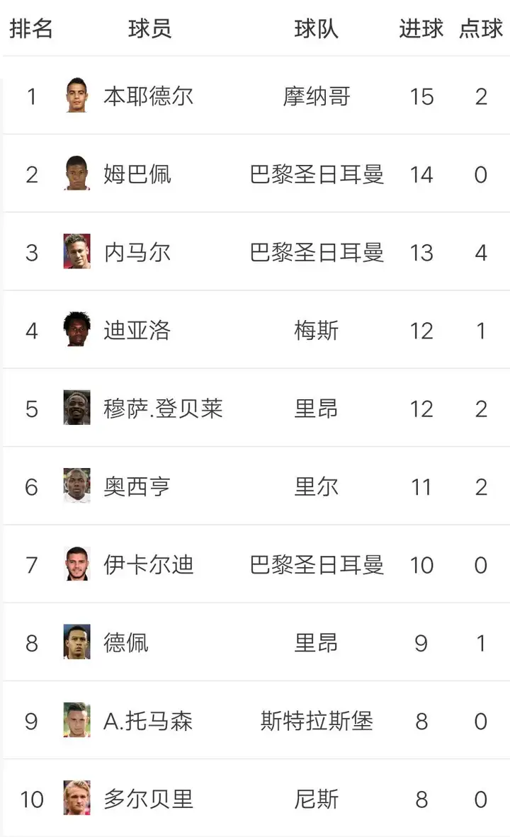 本耶德尔以15粒进球领跑,姆巴佩打进14球紧随其后,内马尔攻入13球排名第三,迪亚洛和登贝莱同进12球。