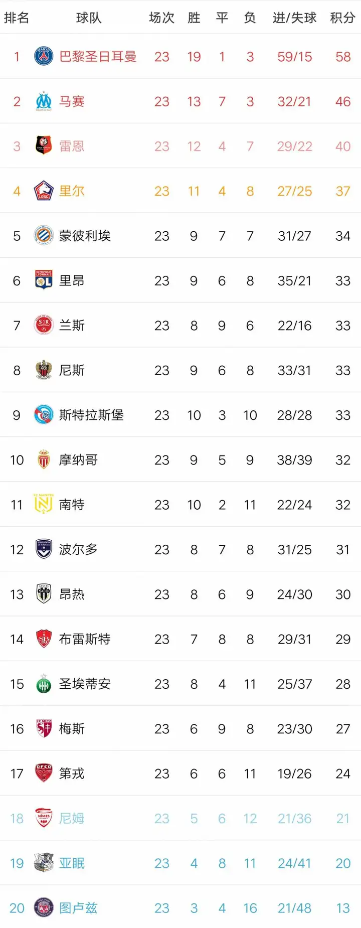 巴黎圣日耳曼以58分皇冠国际体育高居榜首,马赛积46分位列次席,雷恩积40分排名第三,里尔和蒙彼利埃分列四五位。