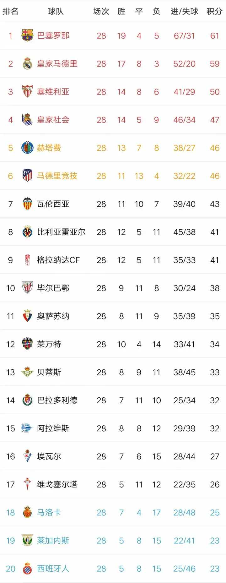 巴萨以61分占据榜首,皇马积59分位居次席,塞维利亚积50分排名第三,皇家社会、赫塔费和马竞分列四到六位。