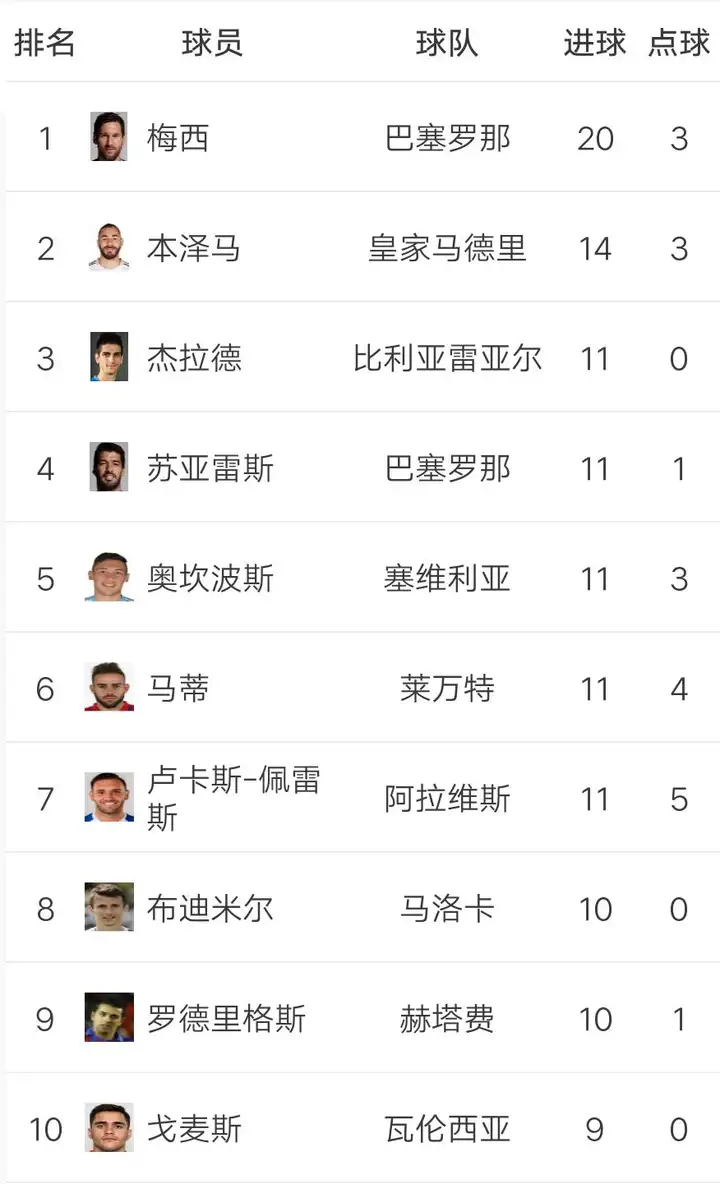 梅西以皇冠足球20粒进球傲视群雄,本泽马攻入14球排名次席,杰拉德-莫雷诺、苏亚雷斯、奥坎波斯、马蒂和卢卡斯-佩雷斯则有11球入账。